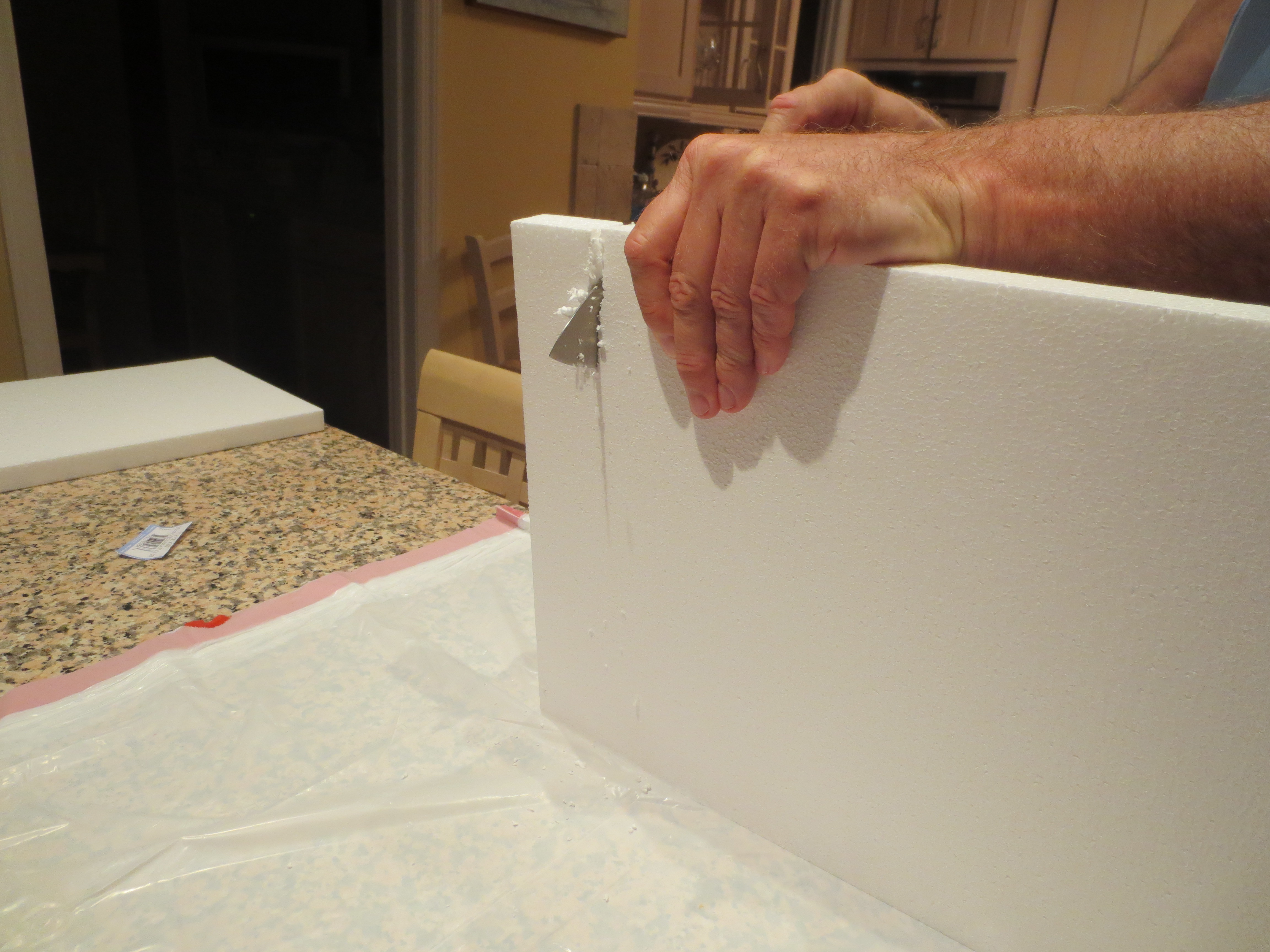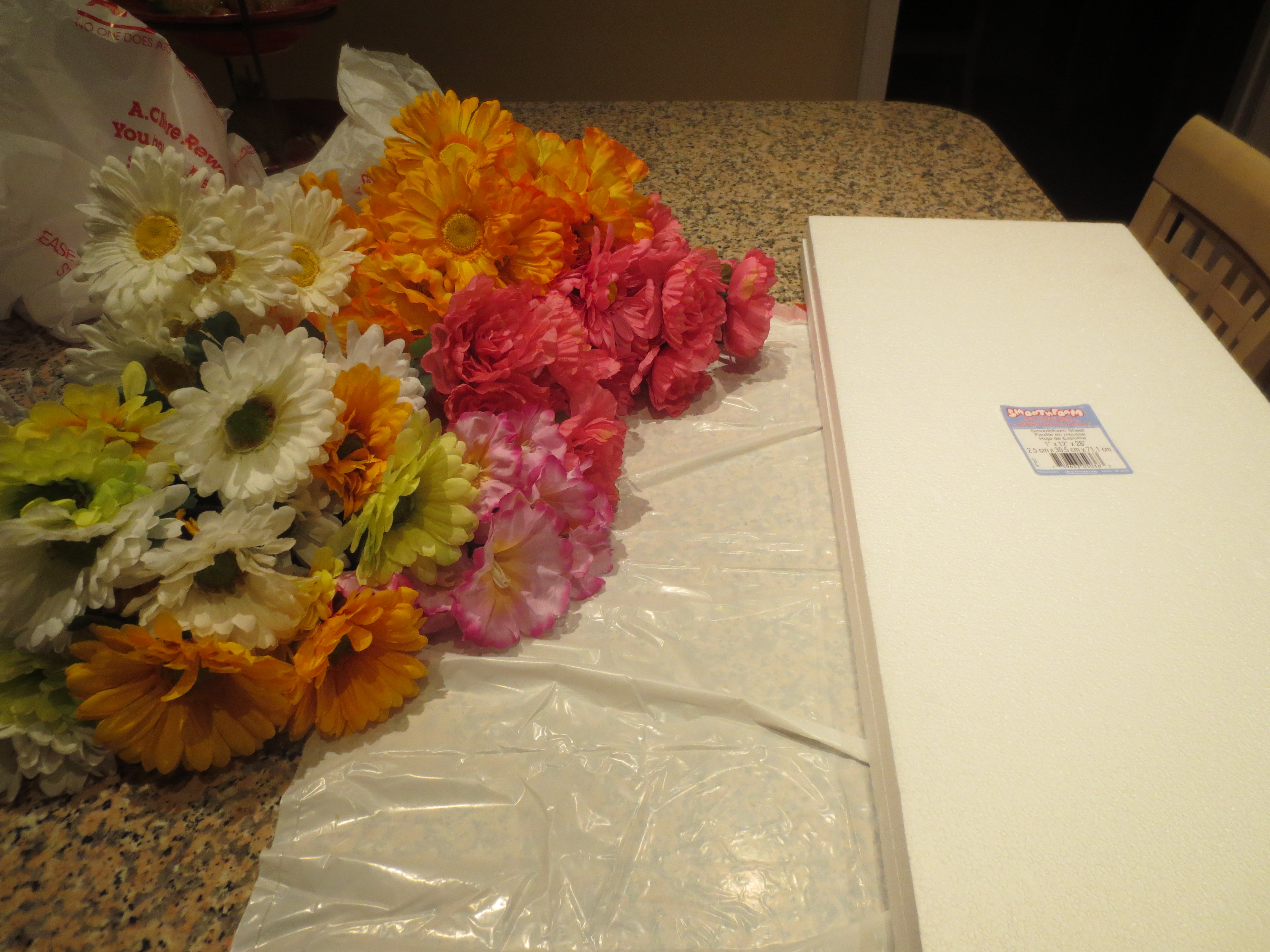 First, I went to A.C. Moore to gather some of the supplies I needed. I bought two pieces of styrofoam (mostly because I was certain I would mess up on the first and need another one) as well as a bunch of fake flowers. The flowers were 50% off and I had a 50% off coupon for one item, so all together this project cost about $25. I laid a garbage bag underneath the styrofoam to avoid as much mess as possible (it still got pretty messy) and started working.