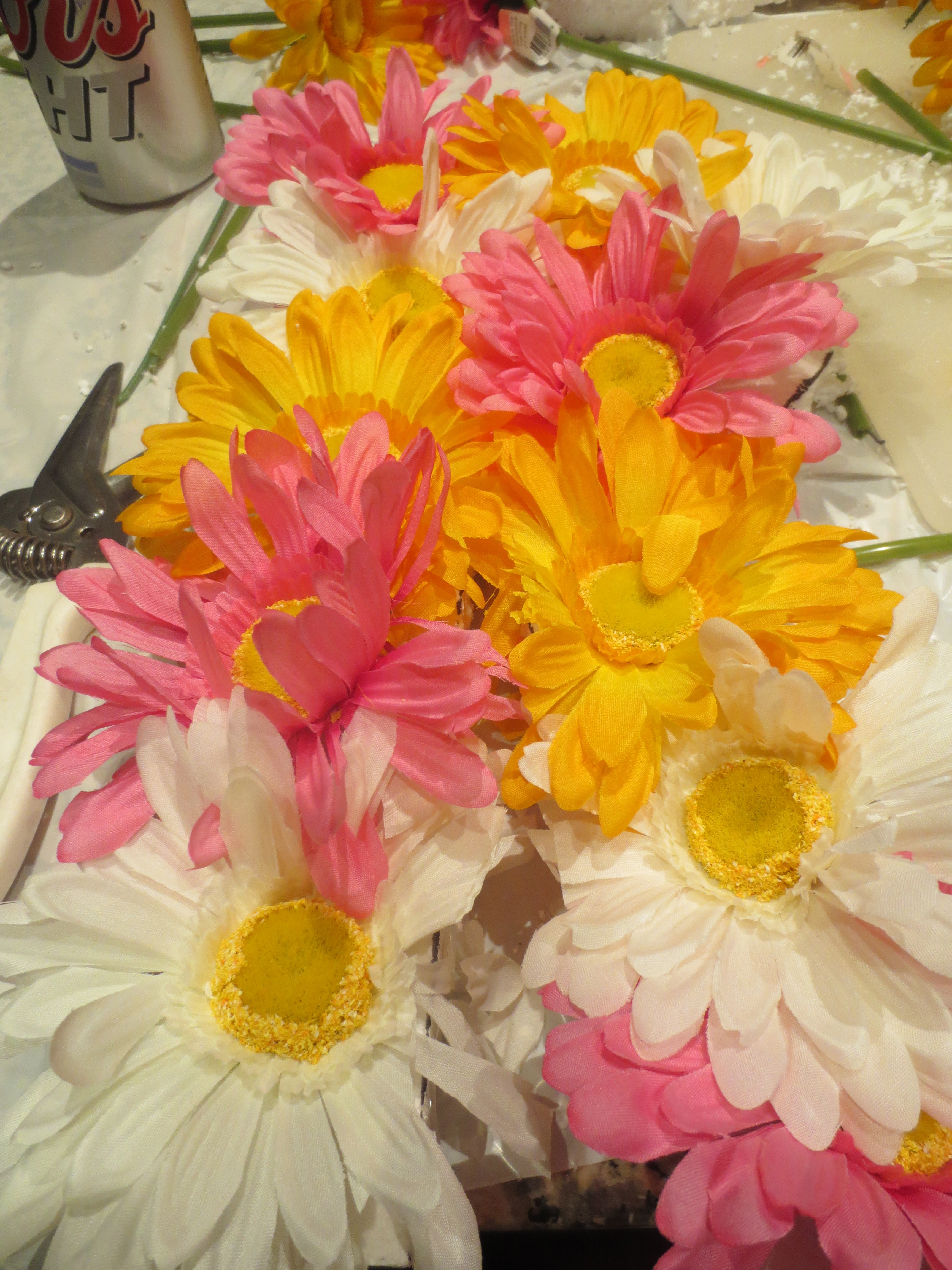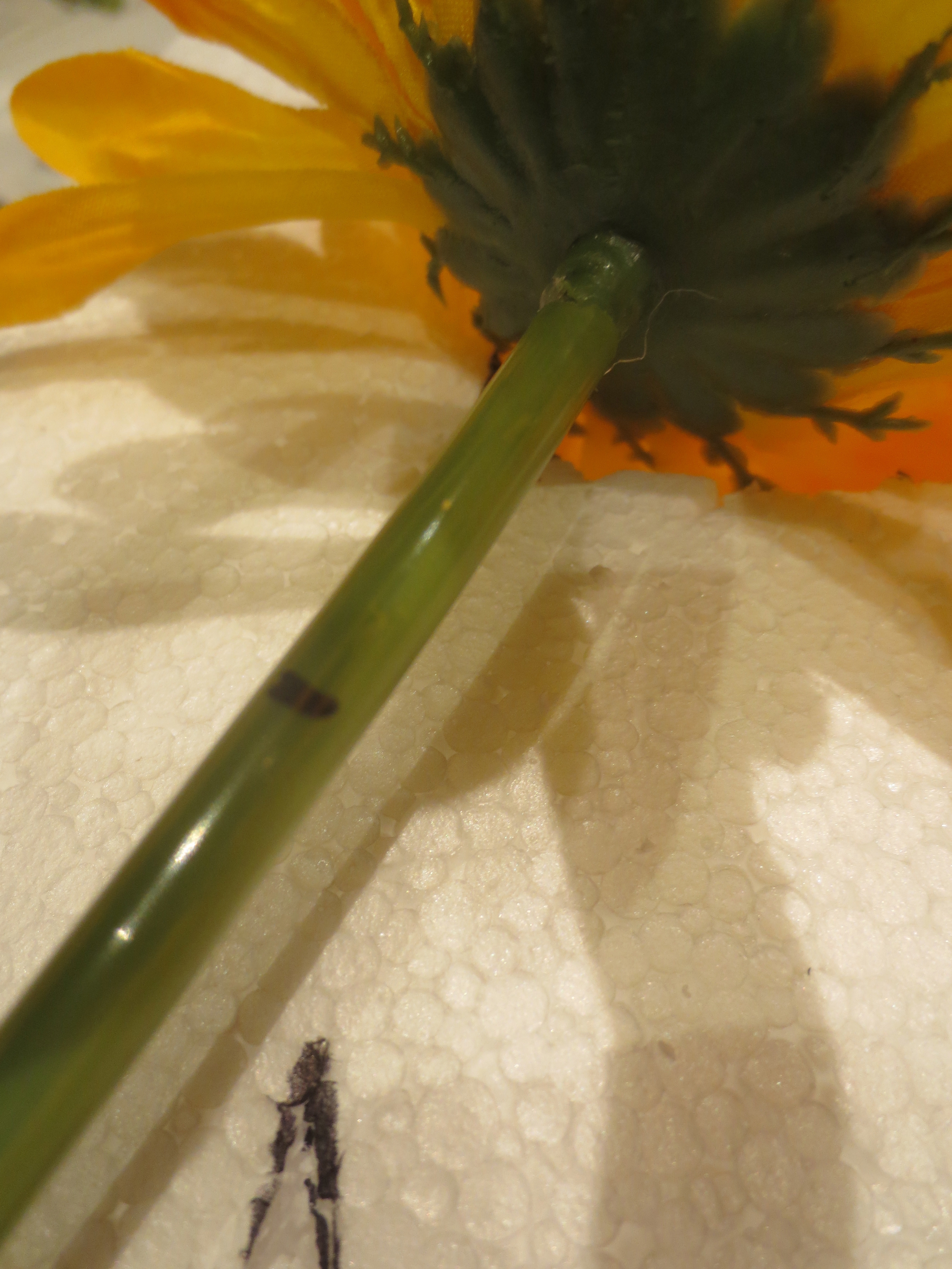 Next began what I thought would be the most fun part of the project. Again, nope. In my head the flower stems would be easy to cut off and would just stick right into the styrofoam. In reality, the stems were near impossible to cut since the had a sneaky little metal wire running down the length of it. After some cutting, twisting, and pulling I was able to separate the flowers from the stem. Positioning them on the styrofoam did prove to be quite easy.